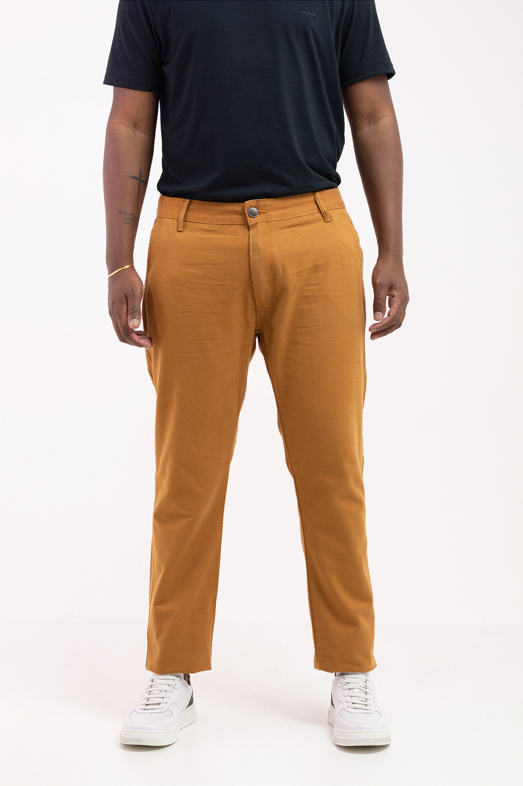 A Calça Alfaiataria Pataloo Caramelo é a evolução do guarda-roupa masculino. A cor Caramelo (Camel) se tornou o novo "coringa" da moda, permitindo combinações incríveis tanto com sapatos sociais quanto com tênis casual branco.