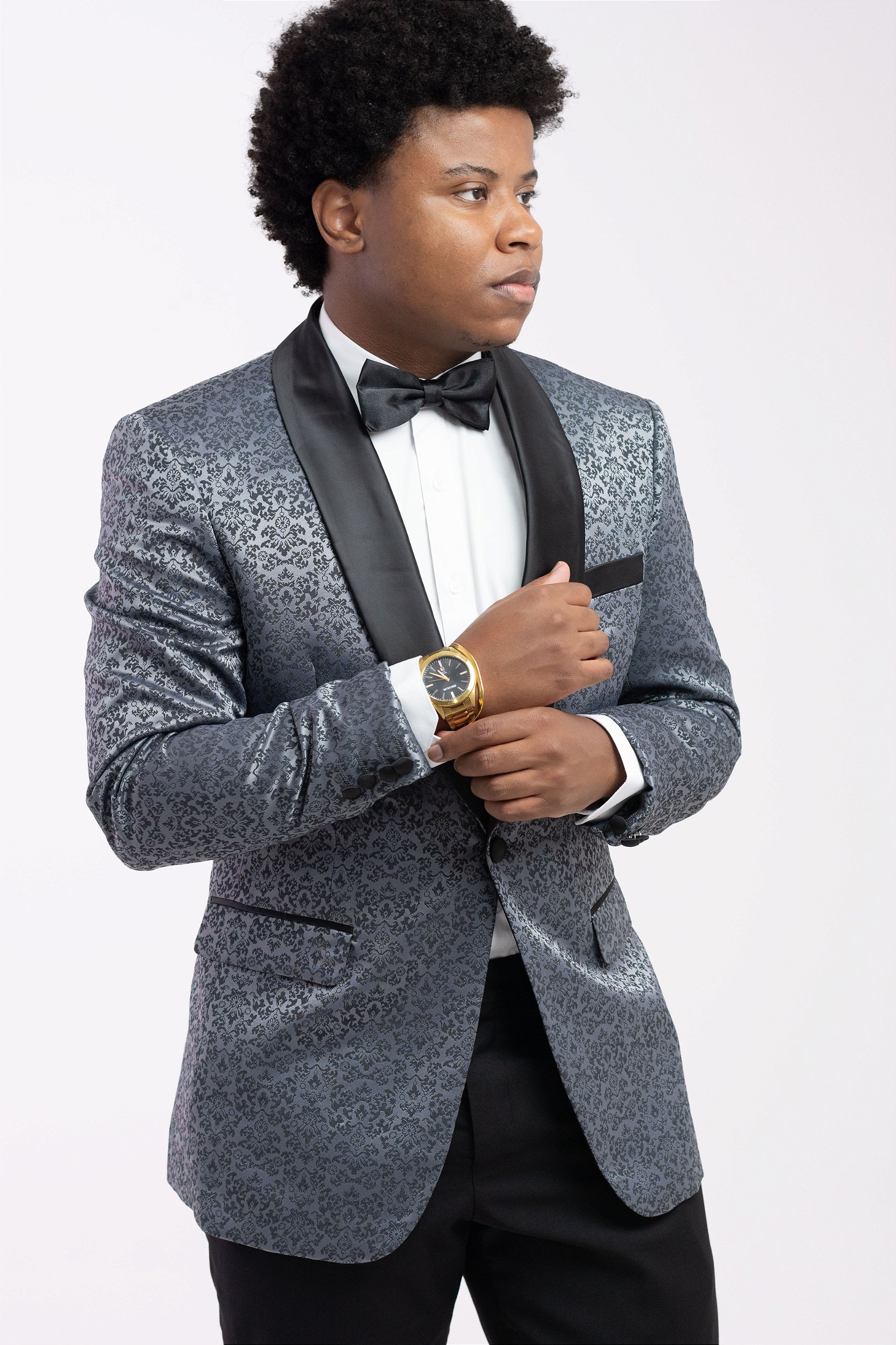 Presença máxima com elegância moderna. Garanta agora seu Smoking Pataloo Grafite Jacquard.